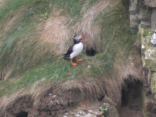 Puffin outside its burrow on the Castle of Burrian
